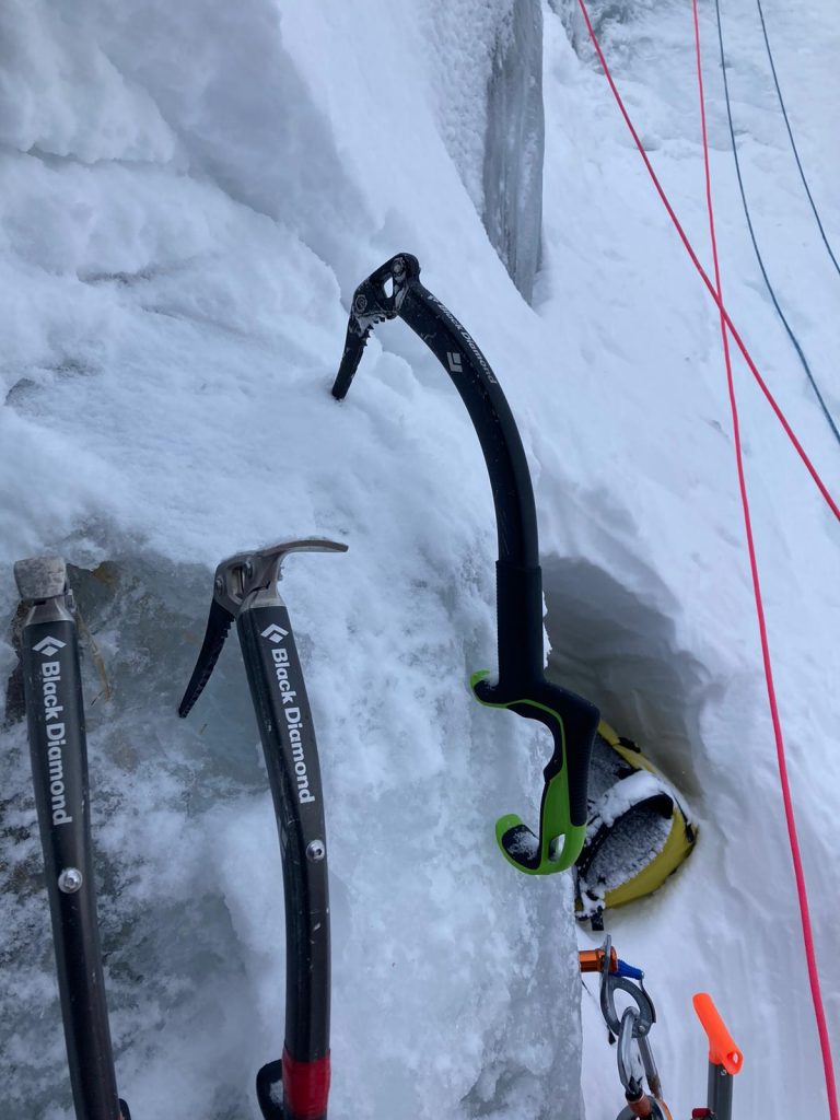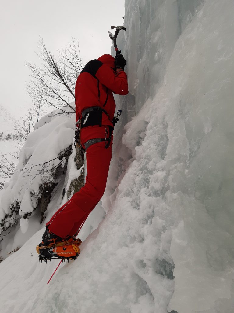 Duminică, ultima zi a atelierului, va fi dedicată căţărării pe gheaţă. Ne este de folos o cascadă aflată nu departe de baza noastră. Accesul nu este deloc facil, chiar şi pe schiuri de tură. Organizăm două platforme, depozităm echipamentul şi îl filăm pe Aurel ȋn timp ce urcă ȋn mod cap de coardă prima cascadă. Toți am mai exersat acest tip de căţărare, nu suntem novici. Dar chiar şi așa, tehnica poate fi ȋmbunătăţită. Din nou sfaturile ȋncurajatoare venite de jos te ajută: “Lasă călcâiele ȋn jos!”. Interesant, chiar funcţionează. Senzaţia de efort dispare, poţi să te bucuri pe deplin de escaladă.