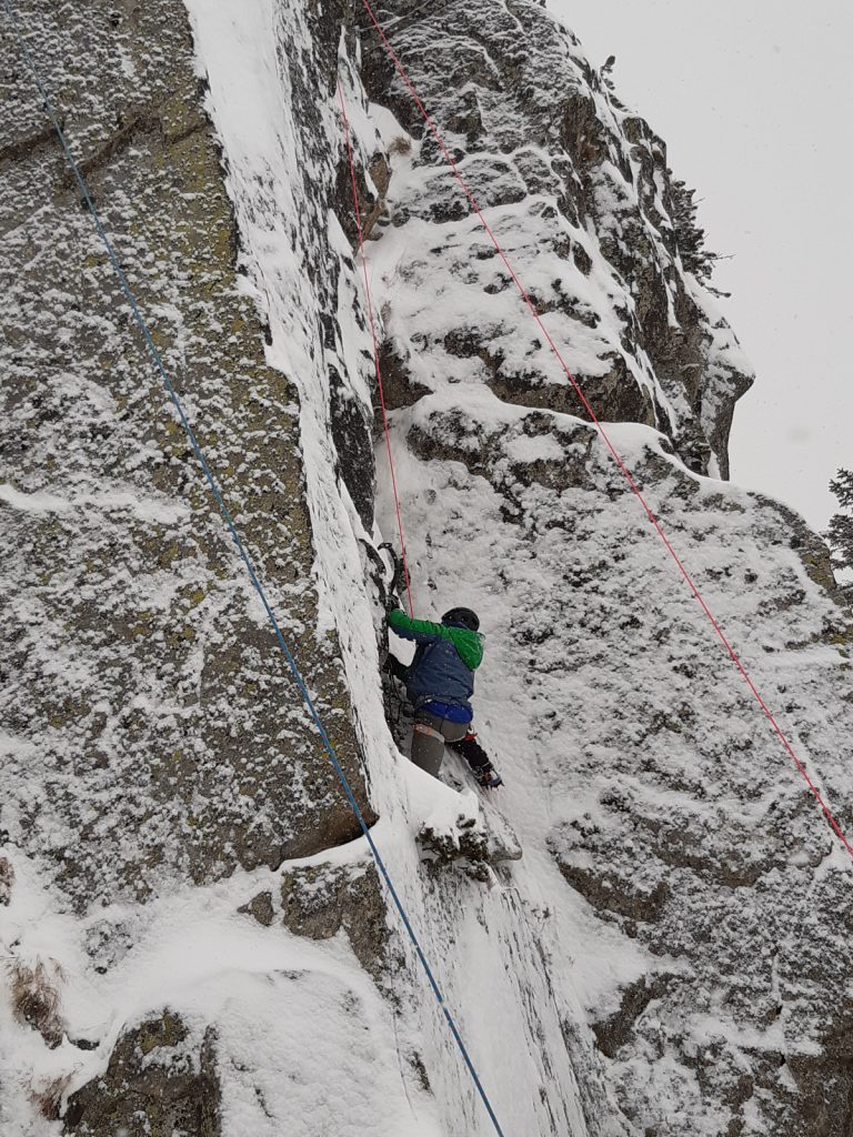 A doua zi, acoperiţi de același cer ȋnchis, dar debordând de energie, ȋn piuituri scurte ale dispozitivelor de salvare din avalanșă ȋn timp ce trecem pe lângă colegul desemnat cu verificarea, ȋncepem să urcăm spre lacul Pietrele. Jumătate din echipă nu ȋntâmpină nicio dificultate și câştigă primii metri, ajutaţi de pieile de focă. Dar, surpriză, cealaltă jumătate a echipei descoperă că la munte iarna nu-i ca vara, ca să cităm din clasici. Scufundați ȋn zăpadă până la nivelul abdomenului, trei ore de efort la limita renunţării le sunt necesare colegilor noştri pentru a accede la primul obiectiv – o mică faleză unde vom exersa tehnicile de dry tooling. Pentru unii doar o ȋncălzire, pentru ceilalţi un work-out presărat cu crampe musculare. Dar “alpinistul place la el durerea”, cum bine spunea un bătrân căţărător maghiar din Ardeal.